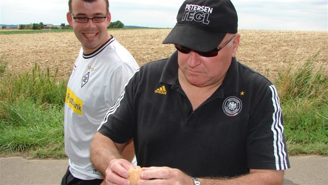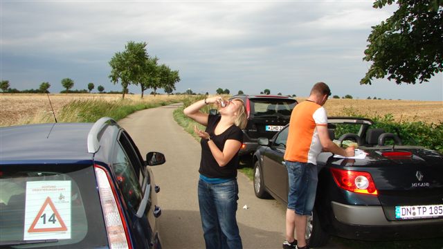 Endlich war es wieder soweit. Am 07.08. gingen 19 Fahrzeuge mit insgesamt 57 Insassen in Vettweiß-Gladbach an den Start, um die vom Fan-Club ausgearbeitete Strecke über ca. 25 km und einer geplanten Fahrtzeit von ca. 3 Stunden zu meistern. Die Teams erhielten Unterlagen mit 27 Fragen, die während der Fahrt bewältigt werden mussten. Die Antworten fanden sich überwiegend rechts und links vom Straßenrand. Zudem gab es 7 Fragen zum Allgemeinwissen. Außerdem hatte das FC-Team auf der rechten Straßenseite ca. 30 Sichtkontrollen (Symbol-Schilder) aufgehängt und -gestellt, die bei Sichtung in die Bordkarte eingetragen werden mussten. Gleiches galt für 8 Fotos, deren Kopien alle Teilnehmer vor der Fahrt in Farbe erhielten. Des Weiteren galt es, 2 Durchgangskontrollen zu durchlaufen, bei denen es neue Fahranweisungen und eine neue Bordkarte gab. Als kleine Sonderaufgabe mussten die Teams von der ersten bis zur zweiten Durchgangskontrolle ein rohes Ei besorgen.